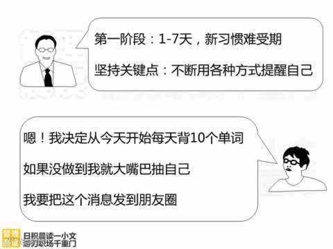 第一阶段:l一7天,这个阶段你必须不时提醒自己注意改变,并刻意要求自己。因为你一不留意,你的坏情绪、坏毛病就会浮出水面,让你又回到从前。你在提醒自己、要求自己的同时,也许会感到很不自然、很不舒服,然而,这种“不自然、不舒服”是正常的。