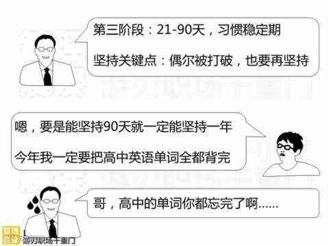 第三阶段:2l一90天,这一阶段是习惯的稳定期,它会使新习惯成为你生命的一部分。在这个阶段,你已经不必刻意要求自己,它已经像你抬手看表一样的自然了。
