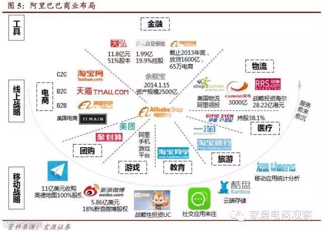 阿里巴巴为布局完善的电商产业闭环,在2003年投资规模达3000亿的菜鸟物流网,以及海尔集团日日顺物流等;同时为弥补移动互联短板,在今年再次入股移动搜索平台UC,并任命UC董事长俞永福担任移动事业部总裁,强势完善移动端入口;今年阿里的另一个重大举动即收购高德,占据国内地图行业重要入口,为布局O2O及LBS打下重要基础。