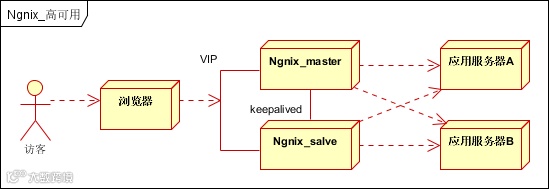 Ngnix高可用,至少包含两个Ngnix服务器,一台主服务器,一台备服务器,之间使用Keepalived做健康监控和故障检测。开放VIP端口,通过防火墙进行外部映射。