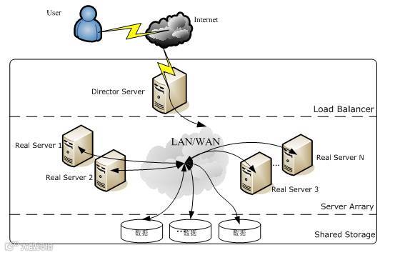 Shared Storage层:是为所有Real Server提供共享存储空间和内容一致性的存储区域,在物理上,一般有磁盘阵列设备组成,为了提供内容的一致性,一般可以通过NFS网络文件系统共享数据,但是NFS在繁忙的业务系统中,性能并不是很好,此时可以采用集群文件系统,例如Red hat的GFS文件系统,oracle提供的OCFS2文件系统等。
