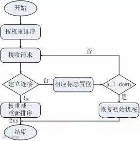 图中有两点需要注意,第一,如果可以把加权轮询算法分为先深搜索和先广搜索,那么nginx采用的是先深搜索算法,即将首先将请求都分给高权重的机器,直到该机器的权值降到了比其他机器低,才开始将请求分给下一个高权重的机器;第二,当所有后端机器都down掉时,nginx会立即将所有机器的标志位清成初始状态,以避免造成所有的机器都处在timeout的状态,从而导致整个前端被夯住。