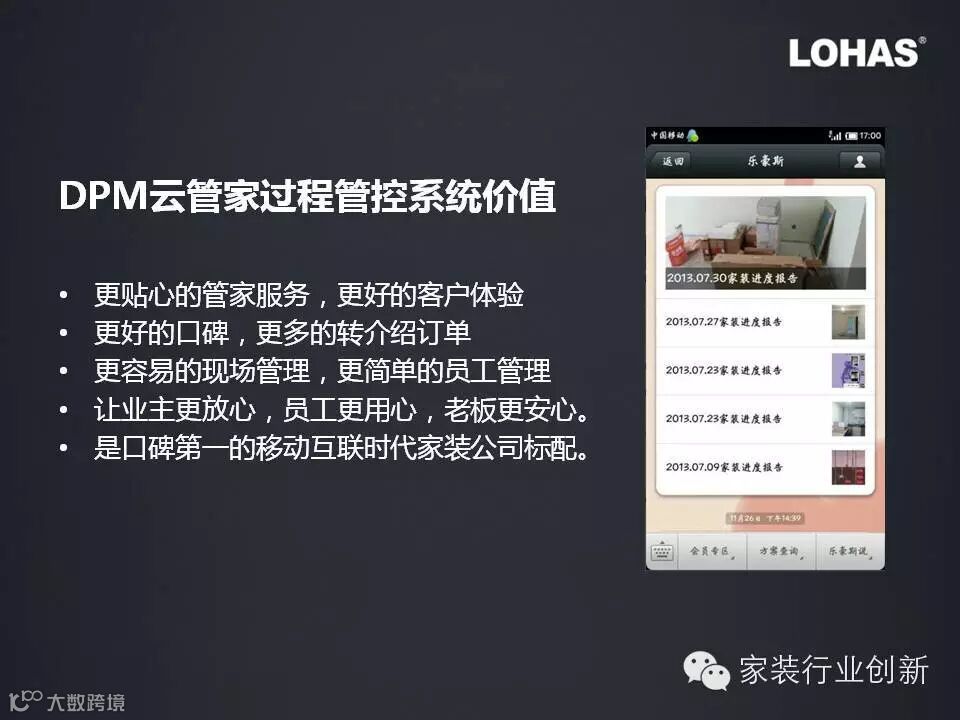 乐豪斯独有的平台+软件+供应链的类京东模式有别于其他家装互联网平台,其他的平台多以提供客户流量为主,没有提高运营效率的软件工具,也没有供应链系统。这二点不是短期内能靠资本打造出来的,这是乐豪斯15年积累的结果。哪个平台更有价值你自有判断。