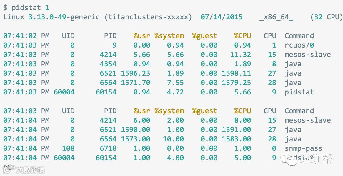 pidstat看上去就像top,不过top的输出会覆盖掉之前的输出,而pidstat的输出则添加在之前的输出的后面。这有利于观察数据随时间的变动情况,也便于把你看到的内容复制粘贴到调查报告中。