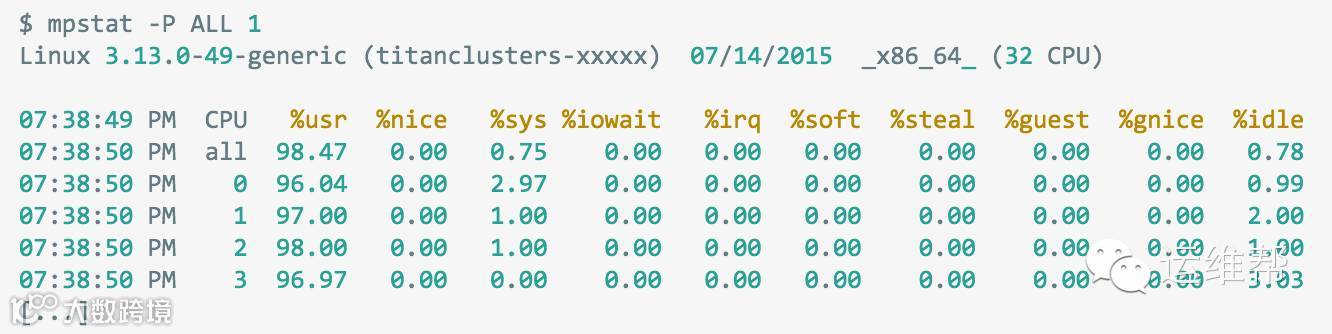 这个命令显示每个CPU的时间使用百分比,你可以用它来检查CPU是否存在负载不均衡。单个过于忙碌的CPU可能意味着整个应用只有单个线程在工作。