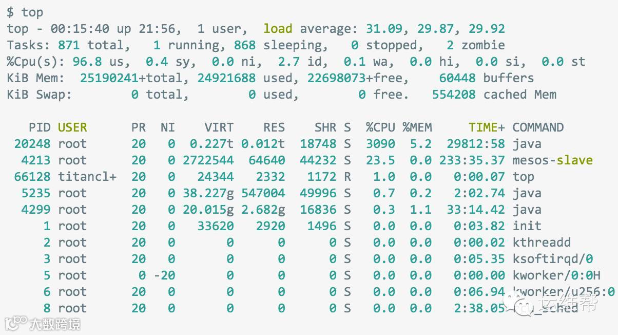 上面的例子表明,CPU主要消耗在两个java进程上。%CPU列是在各个CPU上的使用量的总和;1591%意味着java进程消耗了将近16个CPU。