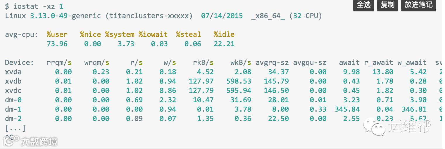 通过相加us和sy的百分比,你可以确定CPU是否处于忙碌状态。一个持续不变的wait I/O意味着瓶颈在硬盘上,这种情况往往伴随着CPU的空闲,因为任务都卡在磁盘I/O上了。你可以把wait I/O当作CPU空闲的另一种形式,它额外给出了CPU空闲的线索。