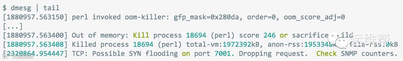 这个命令显示了最新的10个系统信息,如果有的话。注意会导致性能问题的错误信息。上面的例子里就包括对过多占用内存的某进程的死刑判决,还有丢弃TCP请求的公告。