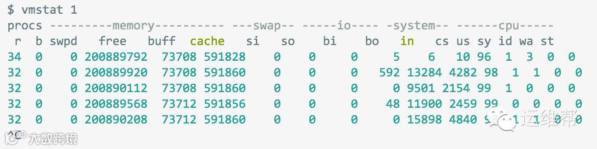 通过指定1作为vmstat的输入参数,它会输出每一秒内的统计结果。(在我们当前使用的)vmstat输出的第一行数据是从启动到现在的平均数据,而不是前一秒的数据。所以我们可以跳过第一行,看看后面几行的情况。