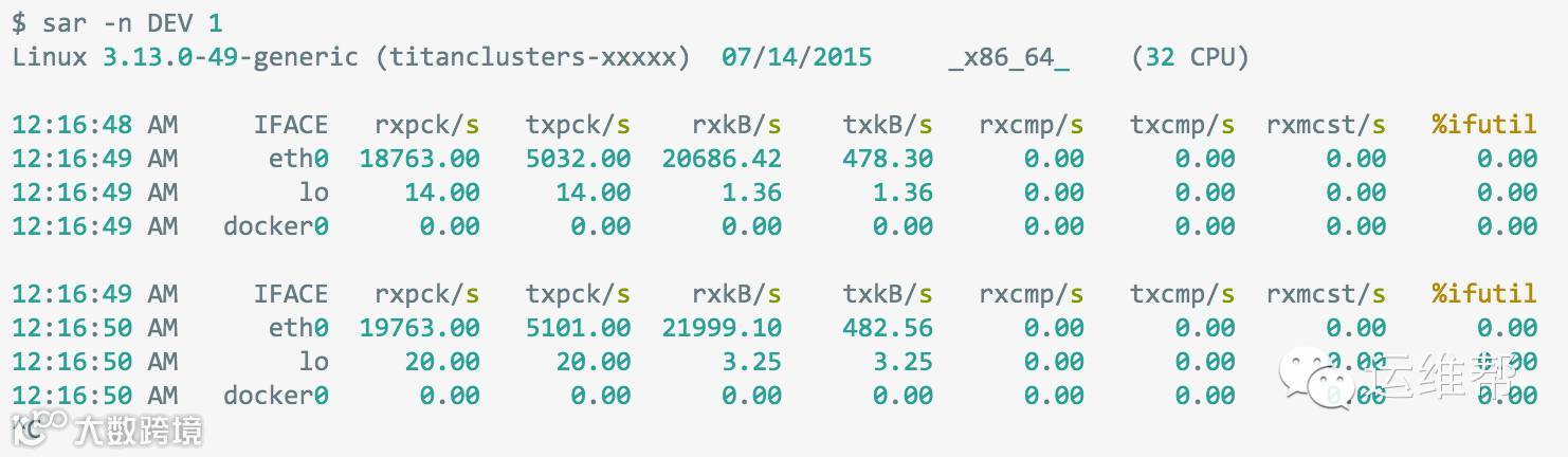 这个命令可以用于检查网络流量的工作负载:rxkB/s和txkB/s,以及它是否达到限额了。上面的例子中,eth0接收的流量达到22Mbytes/s,也即176Mbits/sec(限额是1Gbit/sec)