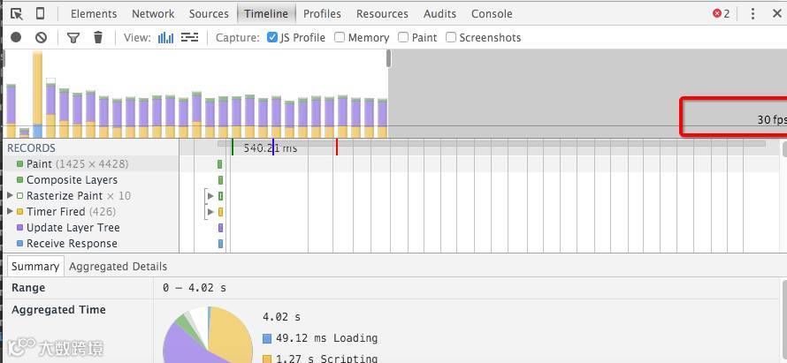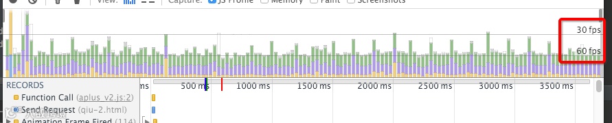 这两个页面的渲染 fps 可以看出来,的确第一个页面很卡。一般我们要求页面要达到 60 fps( 60 帧/秒)。上面说到页面 2 其实也是有稍微的卡顿的,只不过比页面 1 好很多。