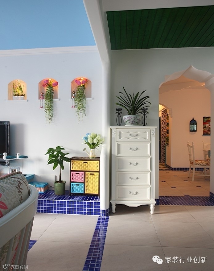 乐装天下整装平台蓝与白:这是比较典型的地中海颜色搭配。 西班牙、摩洛哥海岸延伸到地中海的东岸希腊。 希腊的白色村庄与沙滩和碧海、蓝天连成一片,甚至门框、窗户、椅面都是蓝与白的配色,加上混着贝壳、 细沙的墙面、小鹅卵石地、拼贴马赛克、金银铁的金属器皿,将蓝与白不同程度的对比与组合发挥到极致。