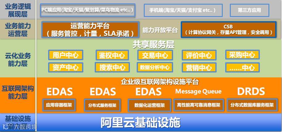 沈询表示,阿里的系统自上而下分为5个层面,分别是业务逻辑展现层、业务能力运营层、云化业务能力层、企业级互联网架构能力层和阿里云基础设施。