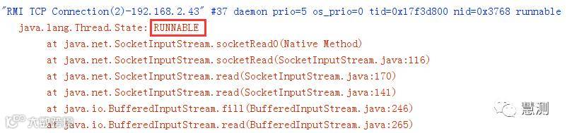 那么处于RUNNABLE的线程是不是一定消耗CPU呢?实际上不一定。下面的线程堆栈表示该线程正在从网络读取数据,尽管下面这个线程显示RUNNABLE状态,但实际上网络IO,线程绝大多数时间是被挂起,只有当数据到达之后,线程才被重新唤醒。