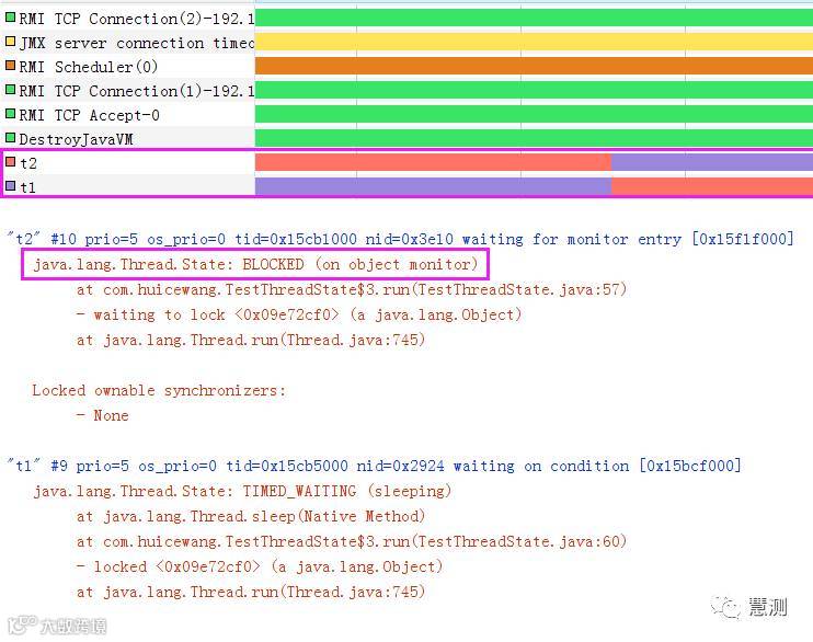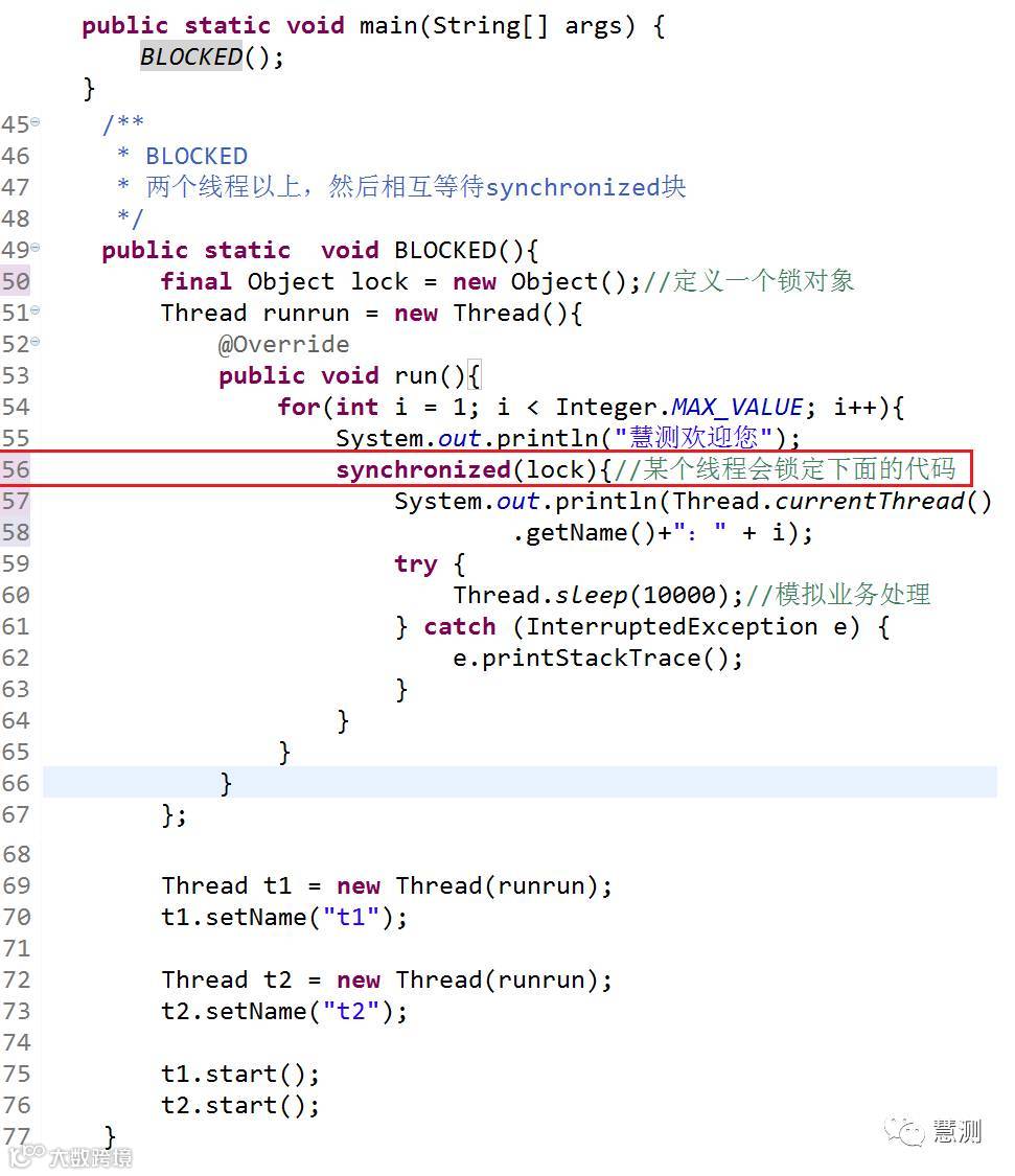 接下来t2开始运行,t2线程执行输出“慧测欢迎您”之后,就要去执行56行代码,来获取lock这个锁对象,但是锁仍然被t1所拥有,在这个时刻t2线程的状态就是BLOCKED。