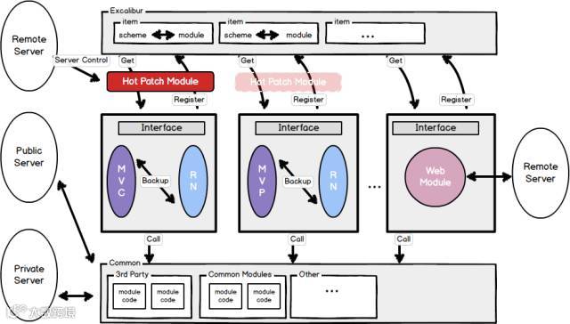 对于业务的组件化,我们采取了业务模块注册机制来达到解耦合的目的。每个业务模块对外提供相应的业务接口,同时在系统启动的时候向Excalibur系统注册自己模块的Scheme(Excalibur是饿了么移动用来保存Scheme与模块之间映射的系统,同时能根据Scheme进行Class反射返回)。 当其他业务模块对该业务模块有依赖时,从Excalibur系统中获取相关实例,并调用相应接口来实现调用,从而实现了业务模块之间的解耦目的。
