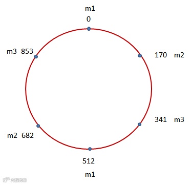 首先请考虑一个圆,在该圆上分布了多个点,以表示整数0到1023。这些整数平均分布在整个圆上: