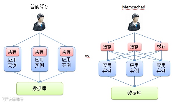 从上图中可以看出,由于Memcached缓存实例是独立于各个应用服务器实例运行的,因此应用服务实例可以访问任意的缓存实例。而传统的缓存则与特定的应用实例绑定,因此每个应用实例将只能访问特定的缓存。这种绑定一方面会导致整个应用所能够访问的缓存容量变得很小,另一方面也可能导致不同的缓存实例中存在着冗余的数据,从而降低了缓存系统的整体效率。