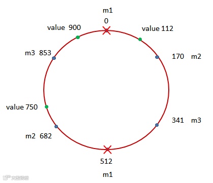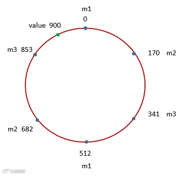 可以看到,该点在顺时针距离上离表示0的那个蓝点最近,因此这个具有哈希值900的数据将记录在Memcached实例m1中。