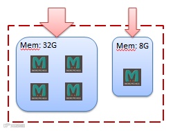 例如上图所展示的缓存系统是由两个服务器组成。这两个服务器中的内存大小并不相同。第一个服务器的内存大小为32G,而第二个服务器的内存大小仅仅有8G。为了能够充分利用这两个服务器的内存,我们在具有32G内存的服务器上部署了4个Memcached实例,而在只有8G内存的服务器上部署了1个Memcached实例。在这种情况下,32G内存服务器上的4个Memcached实例将总共得到4倍于8G服务器所得到的负载,从而充分地利用了32G内存服务器上的内存。