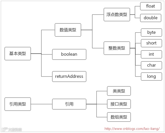 Java虚拟机通过某些数据类型来执行计算。数据类型可以分为两种:基本类型和引用类型,如下图: