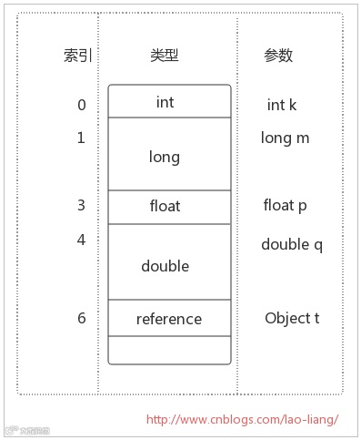 局部变量区被组织为以字长为单位、从0开始计数的数组。字节码指令通过从0开始的索引使用其中的数据。类型为int, float, reference和returnAddress的值在数组中占据一项,而类型为byte, short和char的值在存入数组前都被转换为int值,也占据一项。但类型为long和double的值在数组中却占据连续的两项。