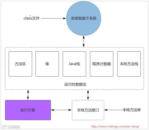 类装载器子系统涉及Java虚拟机的其它几个组成部分以及来自java.lang库的类。ClassLoader定义的方法为程序提供了访问类装载器机制的接口。此外,对于每一个被装载的类型,Java虚拟机都会为它创建一个java.lang.Class类的实例来代表该类型。和其它对象一样,用户自定义的类装载器以及Class类的实例放在内存中的堆区,而装载的类型信息则位于方法区。