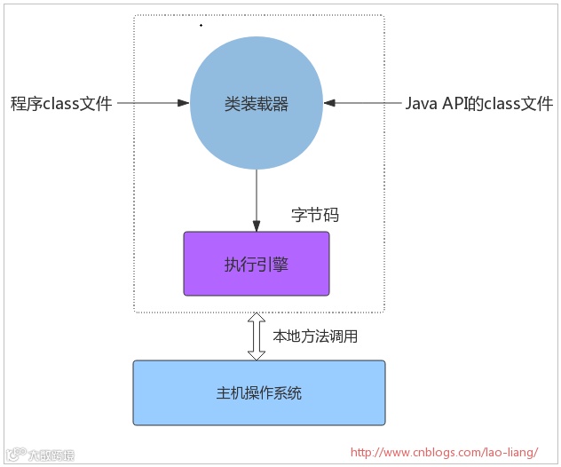 Java虚拟机的主要任务是装载class文件并且执行其中的字节码。由下图可以看出,Java虚拟机包含一个类装载器(class loader),它可以从程序和API中装载class文件,Java API中只有程序执行时需要的类才会被装载,字节码由执行引擎来执行。