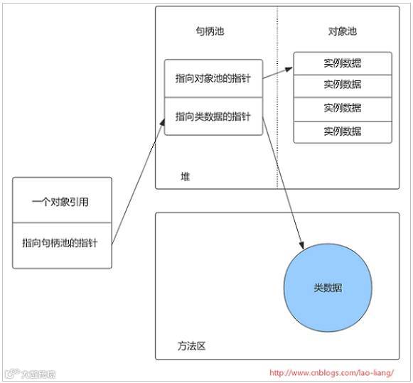 一个句柄池,一个对象池。一个对象的引用就是一个指向句柄池的本地指针。这种设计的好处有利于堆碎片的整理,当移动对象池中的对象时,句柄部分只需更改一下指针指向对象的新地址即可。缺点是每次访问对象的实例变量都要经过两次指针传递。