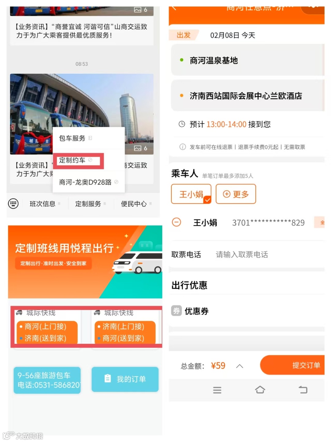 点击定制约车进入购票系统→选择城际快线→选择出发地→选择目的地→选择乘车时间→乘车人,信息确认无误后点击提交订单即可。