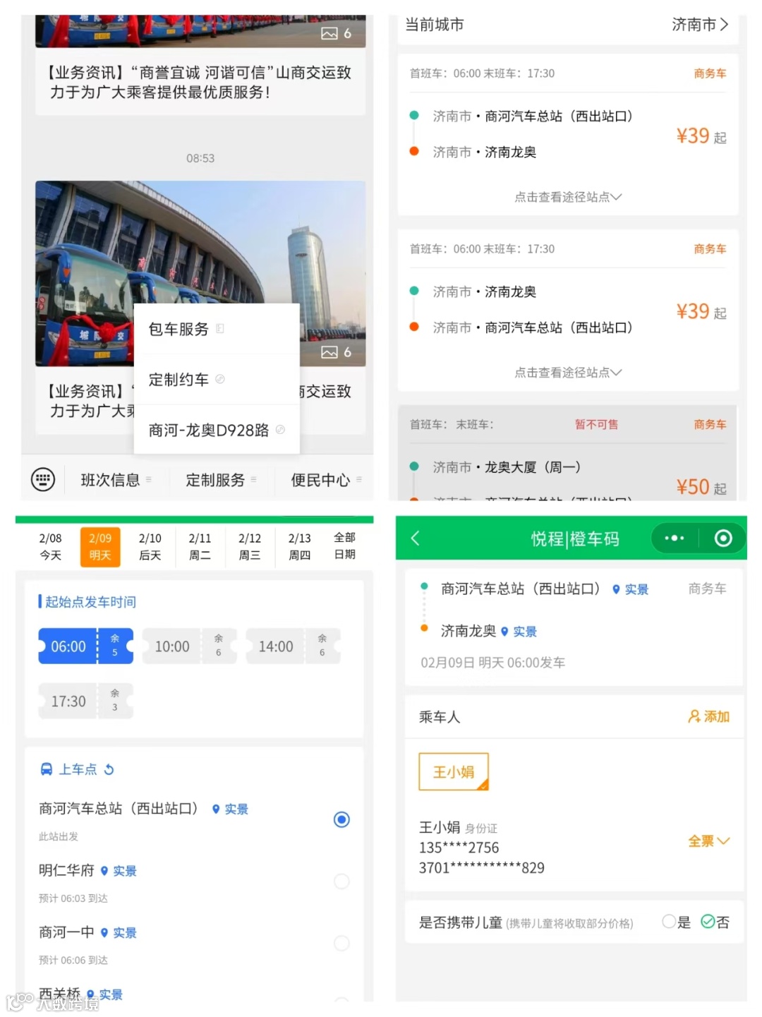 点击商河-龙奥D928路,点击乘车线路即可显示出行日期和余票情况,选择上车地点和下车地点、乘车人,确认支付即可。