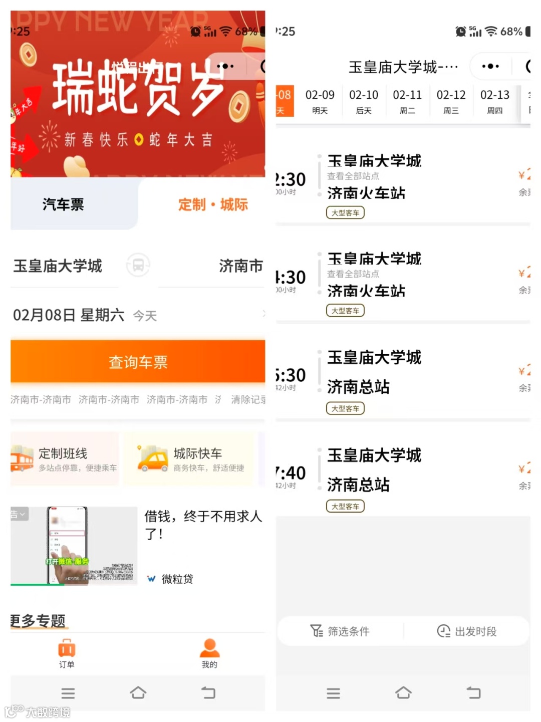 输入出发地点(玉皇庙大学城)目的地(济南市)根据出行需求选择出行日期和班次下单即可