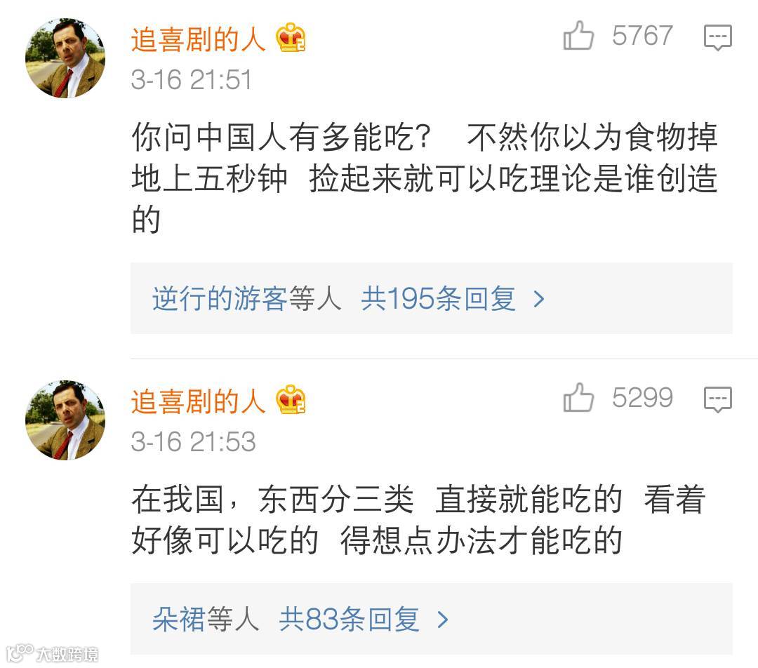 什么事情都爱用吃来形容: 工作不叫工作,那叫饭碗; 开除不叫开除,叫炒鱿鱼。 嫉妒叫做吃醋, 占便宜叫吃豆腐, 被起诉叫吃官司, 拿人好处叫吃回扣, 没遇着人叫吃闭门羹。 没钱了都想着用吃土、喝西北风来形容! 你说,中国人爱不爱吃?