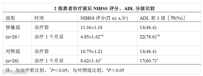 研究结果:干预1个月后2组NIHSS评分、ADL评级较干预前均有改善,且移植组改善明显优于对照组,干细胞移植组患者的后遗症状改善,生活质量提高。