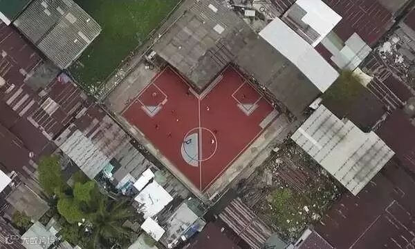 在泰国曼谷空堤县khlong toei,人口非常密集,社区邻里之间的空地都被垃圾和杂物堆满,这样的环境下想拥有足球场简直是奢望。不过,在泰国AP房地产开发商的“良心发现”和创意之举下,奢望变成了现实。球场的基本元素中线、边线、球门,一个都不少。为了保证对抗的公平性,两边场地还要对称。