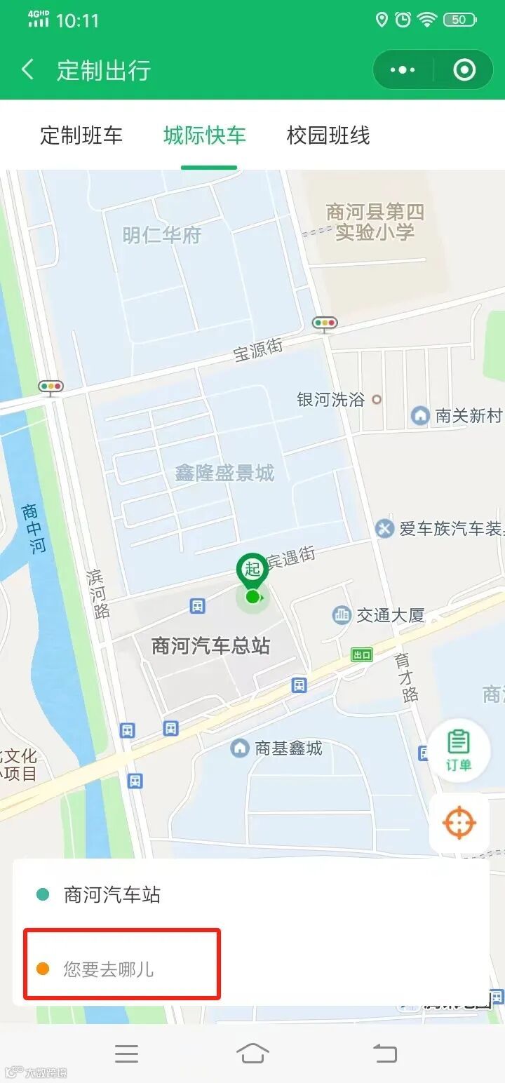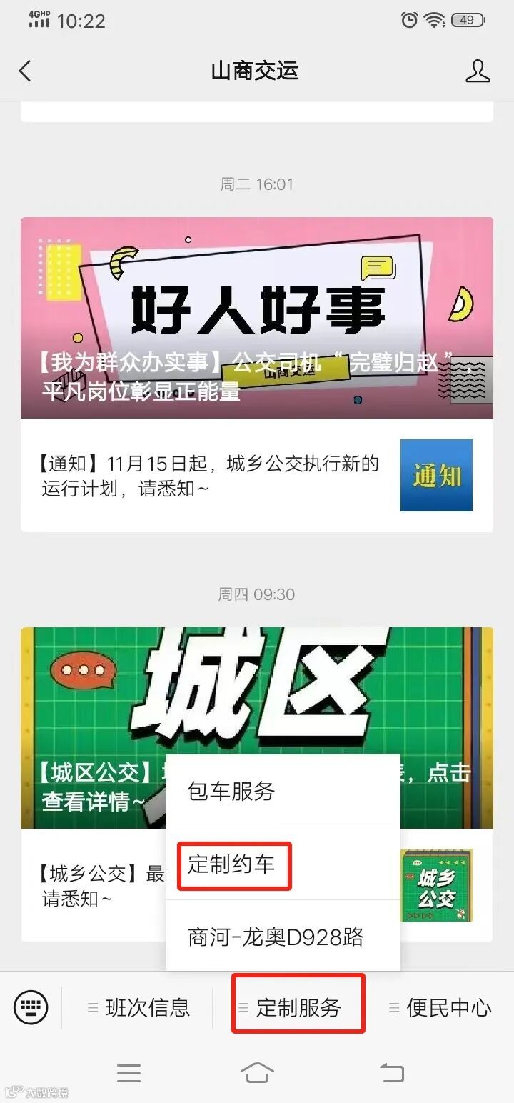 1.关注微信公众号“山商交运”&“商河县汽车站”,点击菜单栏底部【定制服务】,选择【定制约车】进入悦程小程序;