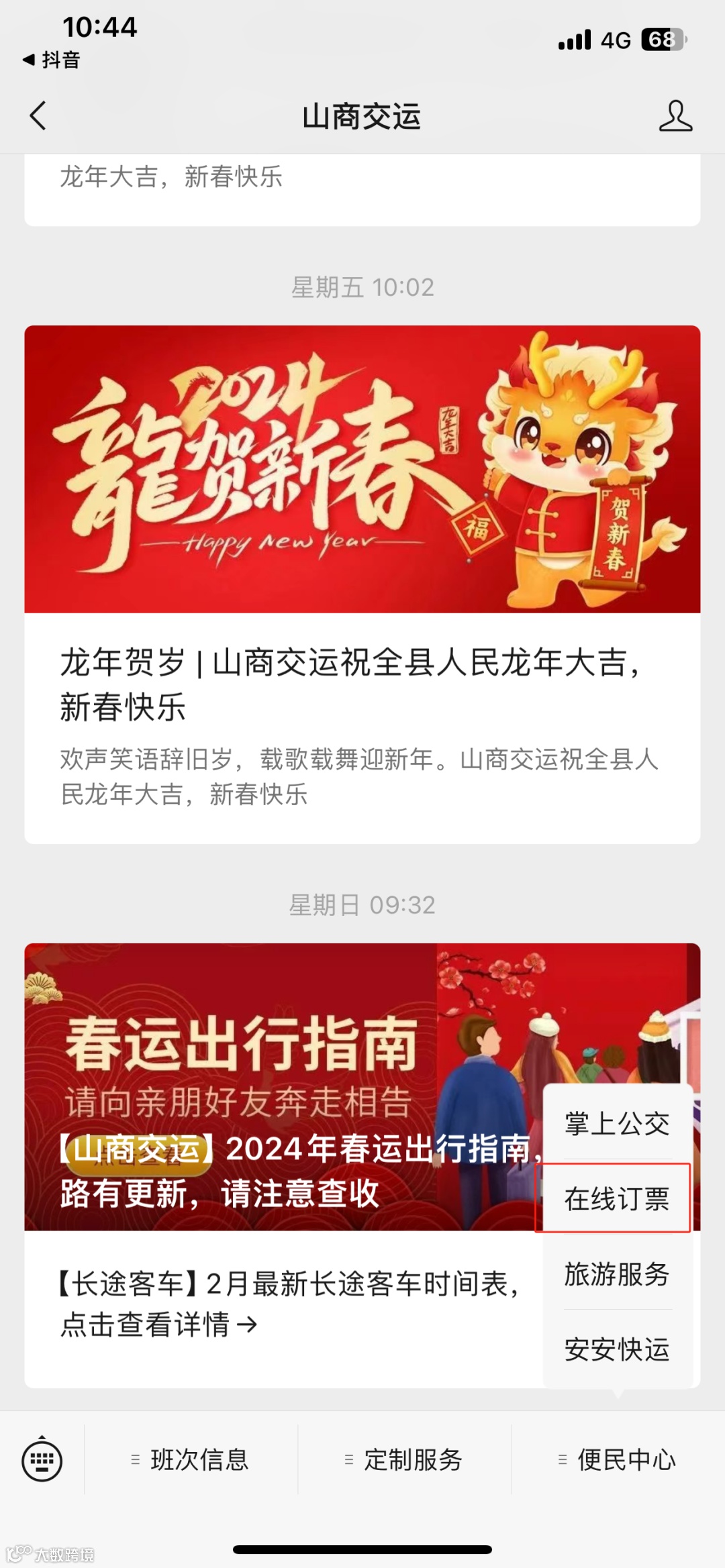 微信公众号【山商交运咨询】,包括商河县长途汽车总站在线客服、班次咨询、约车包车、旅游定制、订票服务、在线退改签等服务功能。