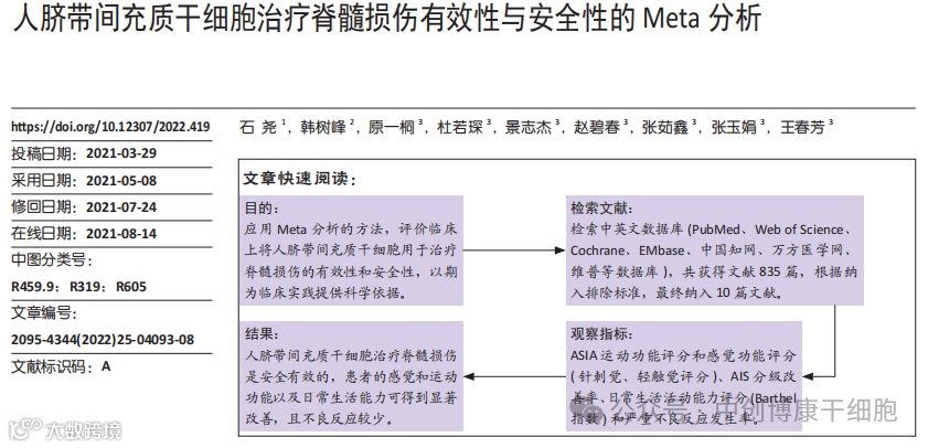现有的临床证据表明,人脐带间充质干细胞治疗脊髓损伤安全有效,患者的感觉和运动功能以及日常生活能力可得到显著改善。