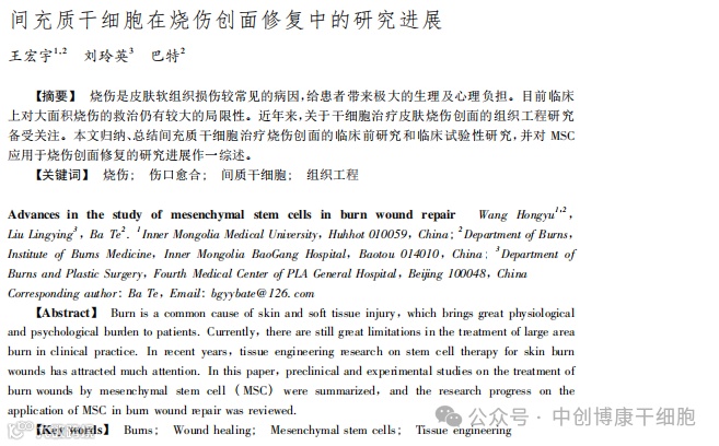 大面积烧伤常由于皮源匮乏,救治延迟而致多器官功能衰竭、重度感染甚至死亡,即使在发达国家,烧创伤仍是造成病死的重要原因。皮肤组织烧伤后尽快促进创面的修复是至关重要的。临床前研究和临床试验性研究均表明,MSC能够有效促进烧伤创面的修复,并在创面愈合的各阶段发挥重要作用。
