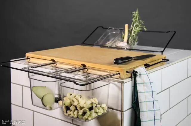 Frankfurter Brett在边缘有可伸缩的收纳支架,装上配套的透明收纳盒后,方便分类各种切好的食材。