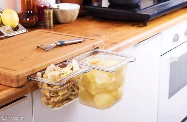 将两边分成切好的食材和丢弃的厨余,刀具一挂一扫就落进收纳盒里,不用再移来移去,非常干净便利。