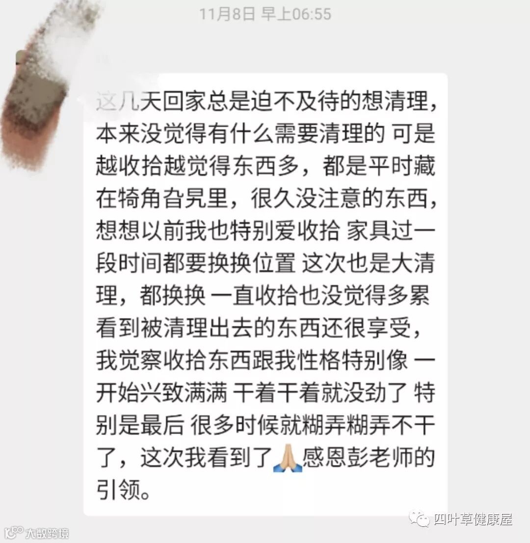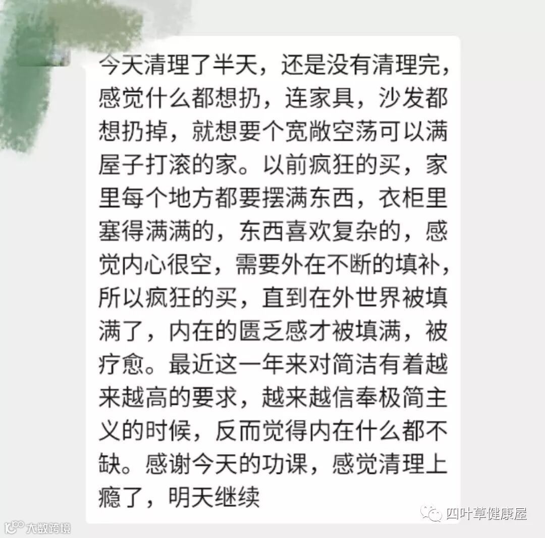 跟随彭老师的心灵训练课程,每期都会有清理功课,对于家的清理早已经渗透到日常生活中了。我喜欢的房子,里面只有生活必需品,家里看起来空空的,但是在里面非常非常的舒服。没体验过的人可能感受不到那种“空”的喜悦,就像没吃过糖的孩子不知道糖有多甜。