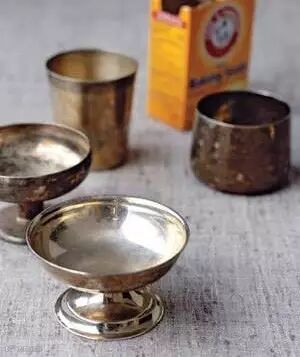 12用小苏打来清洁银器。先洗一下银器,把它放入铺了铝箔纸的锅里,加入苏打溶液(1/4杯小苏打粉、几茶匙盐与一公升沸水) 。静置几分后,化学反应会让所有的表面黑垢消失