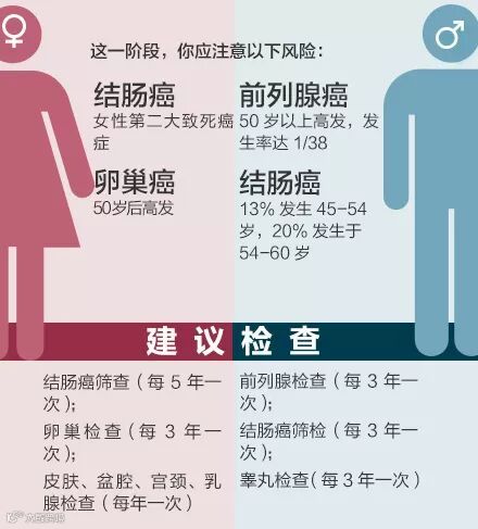 50岁以后,女性的卵巢癌及男性的前列腺癌均属高发期。