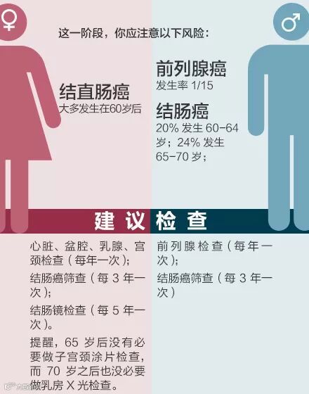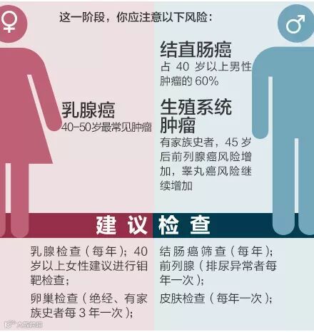 40岁开始,衰老慢慢随之而来,各类癌症风险明显增高!女性尤其要预防乳腺癌,男性注意结直肠癌。