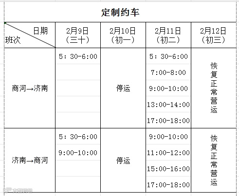 商河→张店:2月8日(腊月二十九)7:00、 9:20、13:30,正月初三恢复 正常