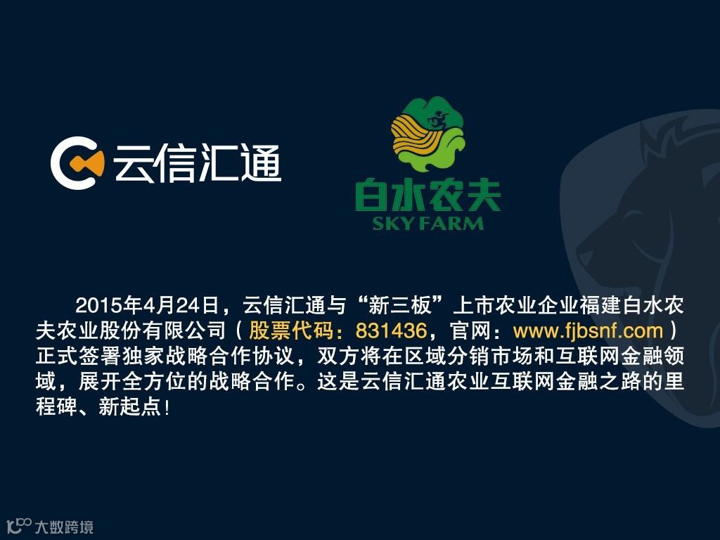 云信汇通是全国第一家采用第三方资金托管的P2P平台,也是中国领先的农业互联网金融公司。财大狮(www.dashi.cn)乃其旗下互联网理财品牌,最高年化利率可达21.5%,并提供T+1和T+0两种普通及快速提现方式,让高收益和流动性兼得!
