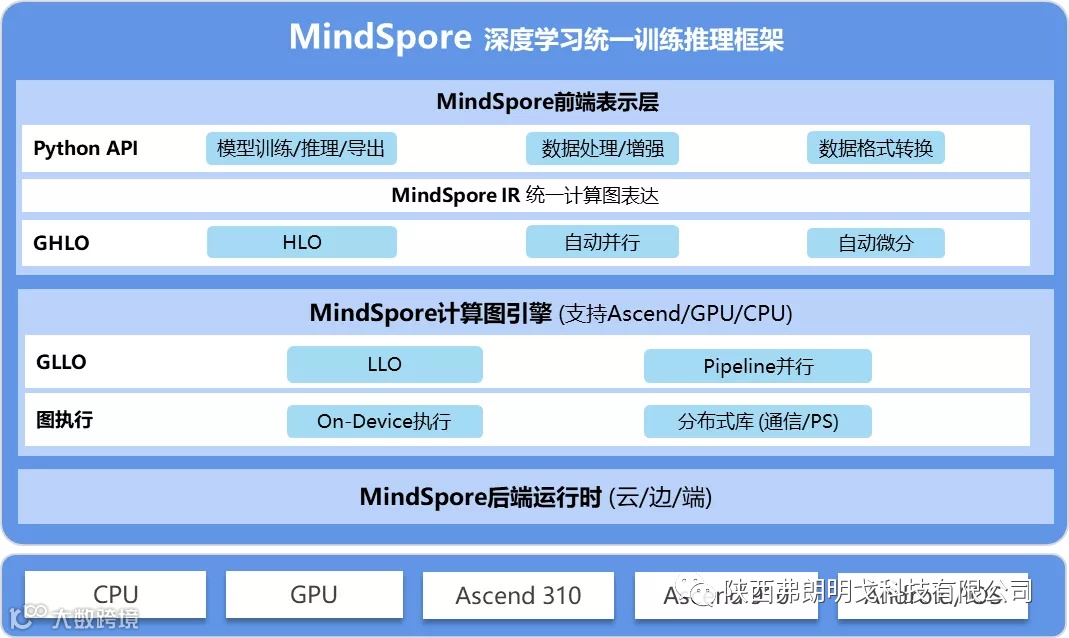 MindSpore 首个开源版本为 0.1.0-alpha 版,主要由自动微分、自动并行、数据处理等功能构成。华为表示,MindSpore 具备开发算法即代码、运行高效、部署态灵活的特点,其核心分为三层:从下往上分别是后端运行时、计算图引擎及前端表示层。