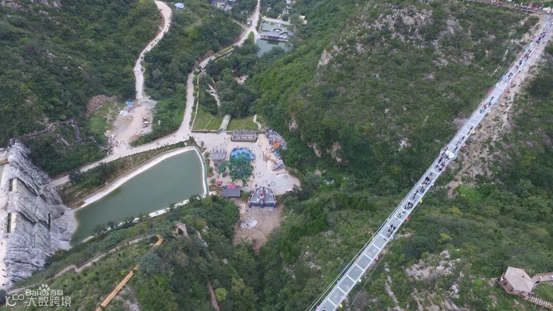 济南青铜山大峡谷空中7D玻璃桥全长356米,距离地面约130米,中间设置圆形八卦图,玻璃桥建于两峰之间,悬崖陡直,中间峡谷横穿,风和日丽之时踏在桥上,彷如御风而行、惊险无比,云深雾重之时,桥上悬空赏景如漫步云端、如云中天桥。