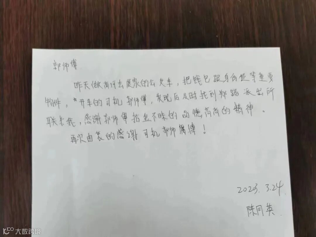 3月23日下午16:00左右,郭师傅驾驶商河到展家城乡公交车,结束运营后,郭师傅按照惯例打扫车厢卫生,突然发现有一个包,包内有现金、银行卡、医保卡等证件,郭师傅根据包内证件联系了郑路派出所,然后联系到失主陈女士后告知到车站领取。